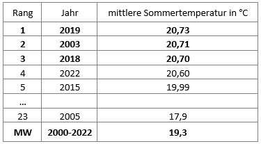 Tab. 1: Ranking und Mittelwert der mittleren Sommertemperaturen (Juni bis August) an der EAH 2000 bis 2022.